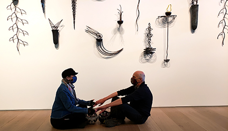 The wall pieces in this image reminded us of the grounding practice of being a vessel on the earth and journeying down in the the earth below through imaginary roots, mycelium, energetic communications in the subtle realm. This photo taken by one of the gallery staff, was initiated by Michael as he thought there was some historical moment here of having to wear masks and be partial, in equivalent censoring as Ohe’s kinetic works having to be non-touchable and censored; all this relates to the theme of making art and sharing it in these challenging times of the pandemic and who knows what else will be upon us in the future that changes our ‘normal’ ways of interrelating in the world.