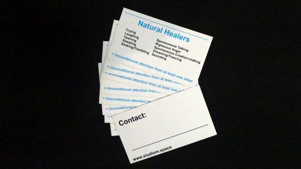 The natural healers are based on our own experience with re-evaluation co-counseling theory and our growing theory of aesthetic-sourced practices. These cards remind us to refresh ourselves daily with loving attention from another being to interrupt the effects of fear, distress, oppression and trauma.