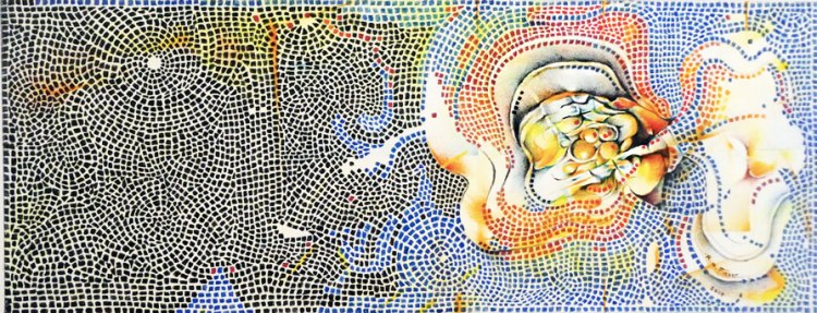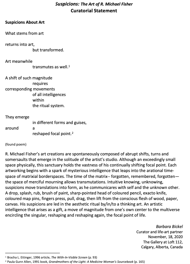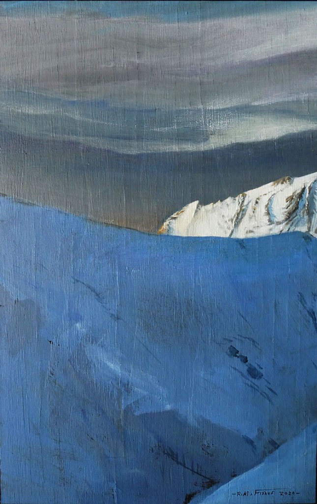 This entire exhibition reflects Fisher’s own mood shifts and cycling reflected in styles not created sequentially but impulsively shifting from one to another. The force of Creation itself is at work, shaping the processes rather than the artist searching or honing a style that fits contemporary market aesthetics or art history. The artist is channeling and “gifting” from Creation’s gift. Fisher’s life-work is to transform the artist as much as the art–always in process–co-emerging and co-fading–on the edge of failure and disappointment.