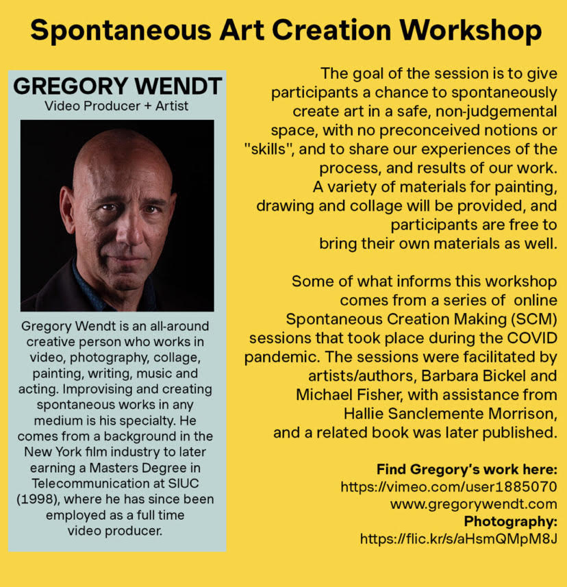 Improvising and creating spontaneous works in any medium is Gregory’s specialty. The goal of Gregory’s Spontaneous Creation-Making workshops is to give participants a chance to spontaneously create in a safe, non-judgmental space, with no preconceived notions or “skills,” and to share their experiences of the process and results of their work. A variety of materials for painting, drawing, and collage are provided, and participants are free to bring their own materials as well.